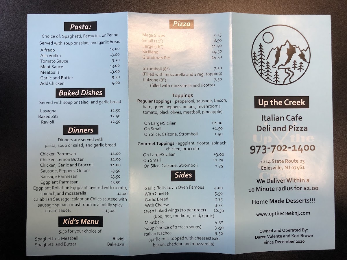 Introducing the menu at Up the Creek Cafe, a charming culinary gem located in Wantage, NJ. This delightful spot welcomes visitors with a warm atmosphere and friendly service, creating a homey dining experience. Known for its made-to-order dishes, the cafe boasts an impressive selection, including delectable pizzas and standout calzones. Patrons rave about the homemade quality and generous portions, with the garlic knots earning high praise. The cafe’s signature cheesecake has also won accolades, being voted the best four years running.